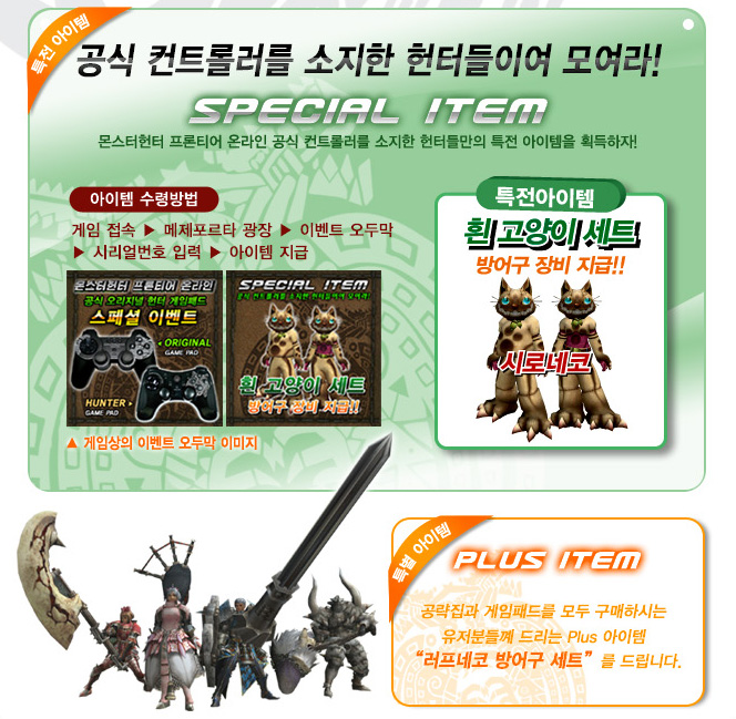 게임내에서 사용할 수 있는 '흰고양이 장비세트(시로네코)' 를 드리며 추가로 몬스터헌터 프론티어 케릭터와 로고가 새겨진 '특별 한정 CD케이스' 를 드립니다.