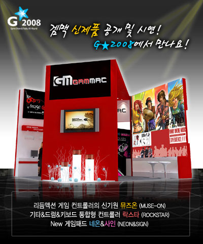 안녕하세요 GAMMAC™입니다. 수능일인 2008년 11월 13일(목) 부터 16일(일)까지 총 4일간 일산 KINTEX 국제전시장에서 열리는 대규모 글로벌 게임쇼 G★2008 에 저희 겜맥이 참가를 결정하게 되었습니다. 국내 5대 온라인게임 메이저업체가 지스타 최초로 모두 참여하며, 국내외 유수의 30여개국 150여개 게임업체가 참가하는 이번 지스타 게임쇼에 여러분을 초대합니다. 저희 겜맥(GAMMAC™)에서는 게임패드 최고 히트상품인 위콘패드와 몬스터헌터 프론티어 온라인 공식 컨트롤러 제품 외에도 각종 미공개 신제품을 공개합니다. ① 리듬액션 게임 컨트롤러의 신기원 뮤즈온(MUSE-ON), ② 기타&드럼&키보드 통합형 컨트롤러 락스타(ROCKSTAR), ③ New 게임패드 네온&사인(NEON&SIGN) 등 새로운 제품을 처음으로 선보이고 가능한 많은분들에게 시연할 수 있는 기회를 드리고자 준비중입니다. 게이머 여러분을 실망시키지 않을 알찬 내용으로 여러분을 찾아뵙겠습니다. 앞으로 많은 관심과 성원부탁드립니다. 감사합니다. ※ GAMMAC™ 부스번호 A404