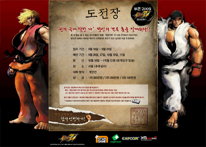 ※ “NSTARGAME 투혼 2009 ‘SF IV’ 시즌1”의 참가 신청은 9월 16일 ~ 24일까지 NSTARGAME 홈페이지(www.nstargame.com/sf)에서 접수받습니다. |
