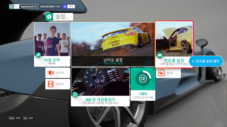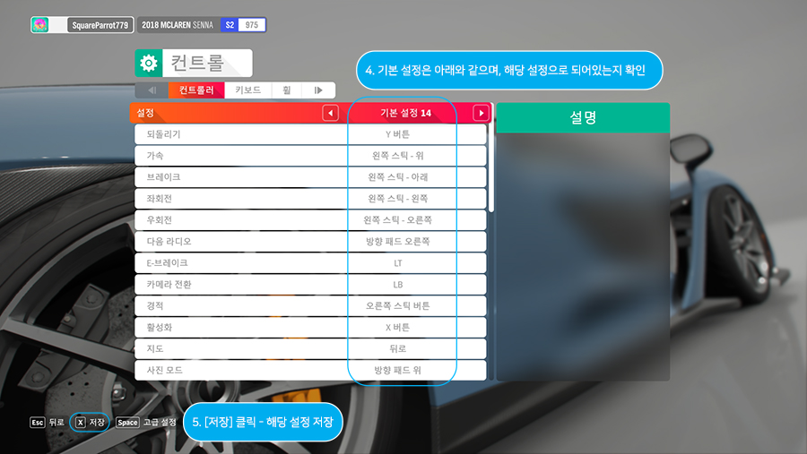 1. [홈] - [설정] 클릭 2. [컨트롤 설정] 클릭 3. '기본 설정 1'을 '기본 설정 14'로 변경 4. (기본 설정은 위의 이미지 참고) 해당 설정으로 되어 있는지 확인 - [저장] 클릭