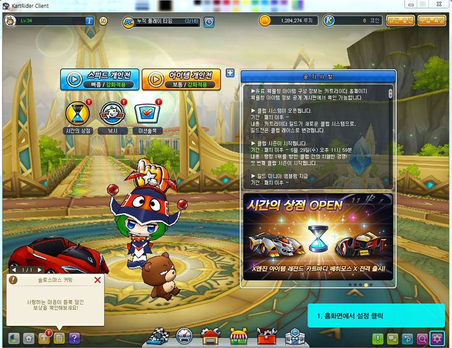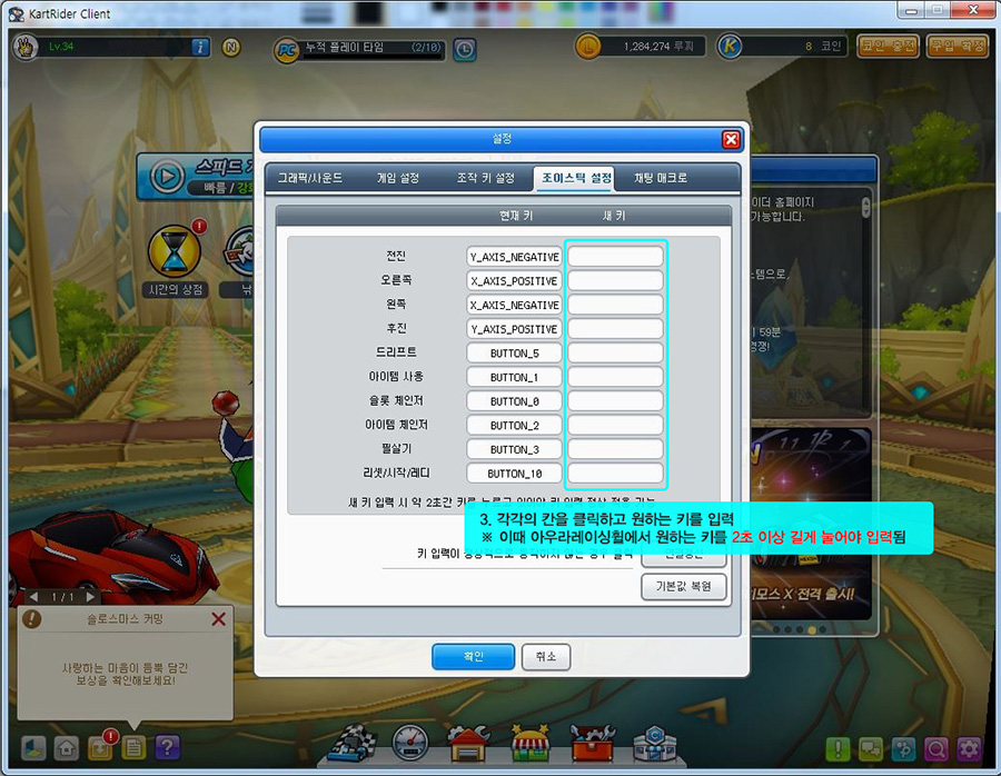 아우라 레이싱휠 카트라이더 설정방법 1. 먼저 홈 화면에서 설정 버튼을 클릭합니다. 2. 설정창 상단에 [조이스틱 설정]을 클릭합니다. 3. 각각의 칸을 클릭하고 원하는 키를 입력합니다. ※이때 아우라 레이싱휠에서 원하는 키를 2초 이상 길게 누르셔야 입력됩니다. 4. 입력시 빈칸이 채워진다. 5. 키 설정방법 -전진 : 엑셀을 밟아줍니다. -오른쪽 : 핸들을 오른쪽으로 돌립니다. -왼쪽 : 휠을 왼쪽으로 돌립니다. -후진 : 브레이크를 밟아줍니다. *드리프트와 나머지 부분은 사용하고자 하는 키로 입력합니다.