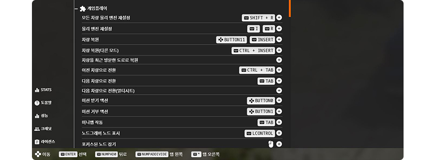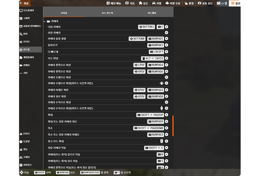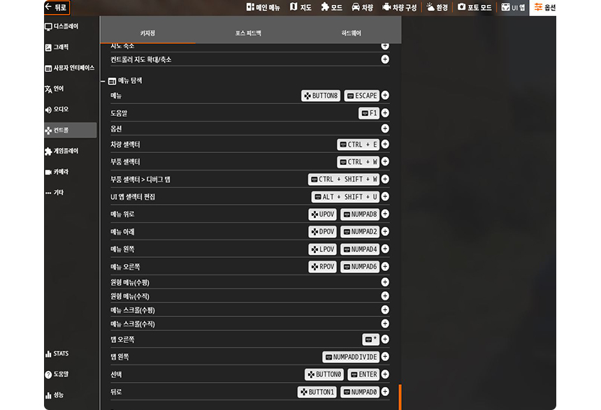 ![]() 게임 실행 > 옵션 > 일반 탭을 선택 필요한 기능을 수동 설정합니다. ![]() ![]() 게임 실행 > 옵션 > 게임플레이 탭을 선택 필요한 기능을 수동 설정합니다. ![]() ![]() 게임 실행 > 옵션 > 카메라탭을 선택 필요한 기능을 수동 설정합니다. ![]() ![]() 게임 실행 > 옵션 > 메뉴 탐색 탭을 선택 필요한 기능을 수동 설정합니다. ![]() ![]() 포스 피드백 수동 설정 필요한 기능을 수동 설정합니다. ![]() 모든 설정 후 상단의 “뒤로” 버튼을 눌러 게임화면으로 돌아갑니다.